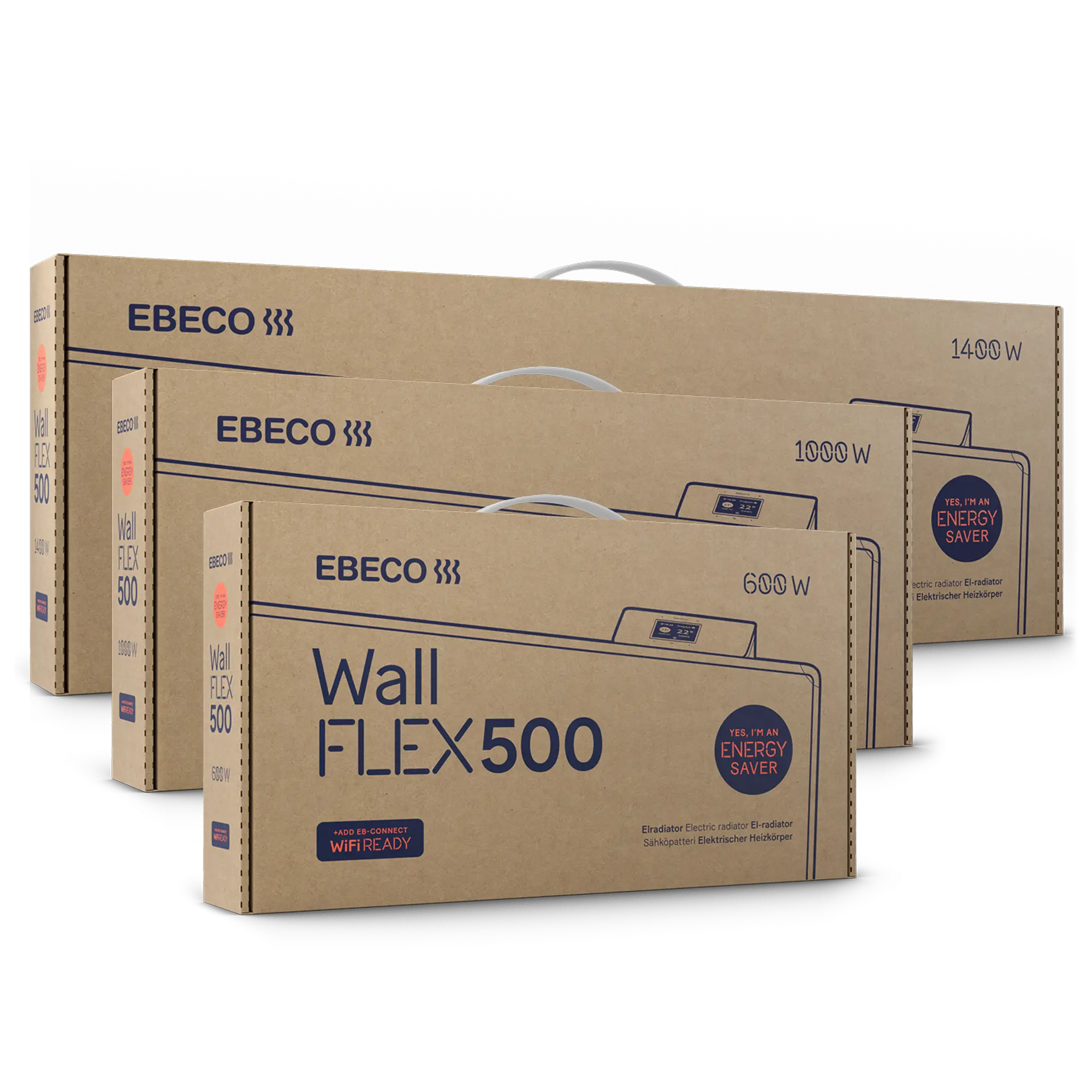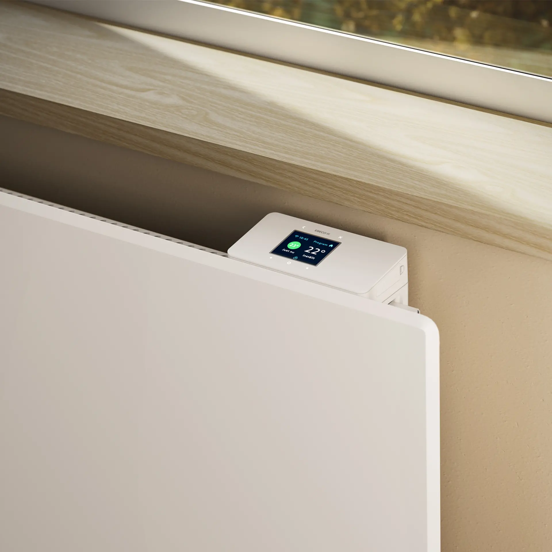 Elektrischer Heizkörper mit energieeffizienter Steuerung und mehreren separat einstellbaren Energiesparprogrammen, mit Farbdisplay mit einfacher Menüführung. Der Heizkörper ist „WiFi READY“, also vorbereitet für eine Verbindung zum WLAN, und kann mit dem Zubehör EB-Connect WiFi über die App Ebeco Connect, Google Home, Tibber sowie über die offene API gesteuert werden. Zeigt auch den Energieverbrauch und den Verlauf in übersichtlicher Weise an.