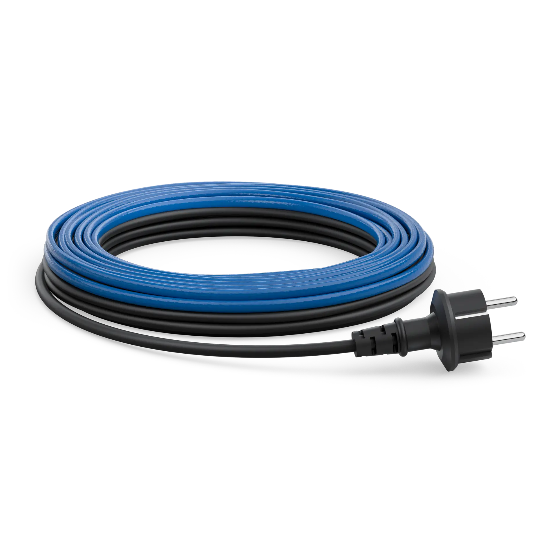 Da das Heizkabel selbstregulierend ist, besteht nicht die Gefahr einer Überhitzung. Nicht einmal, wenn es zur perfekten Anpassung an das Rohr über Kreuz verlegt wird. Es ist parallel-resistiv; das selbstregulierende Heizkabel besteht also aus zwei parallelen Leitern, die in Halbleitermaterial vergossen sind und so ihre Leistung genau an die Umgebungstemperatur anpassen können. Auch wenn draußen Plusgrade sind und kein Frostschutz nötig ist, kann das Heizkabel eingeschaltet bleiben. Um es ganz abzuschalten, müssen Sie den Stecker ziehen oder den Frostvakt Control einsetzen, der die Leistung bei Plusgraden abschaltet. Bei längeren Kabeln und inwendiger Verlegung empfiehlt sich grundsätzlich eine Steuerung mit Thermostat.